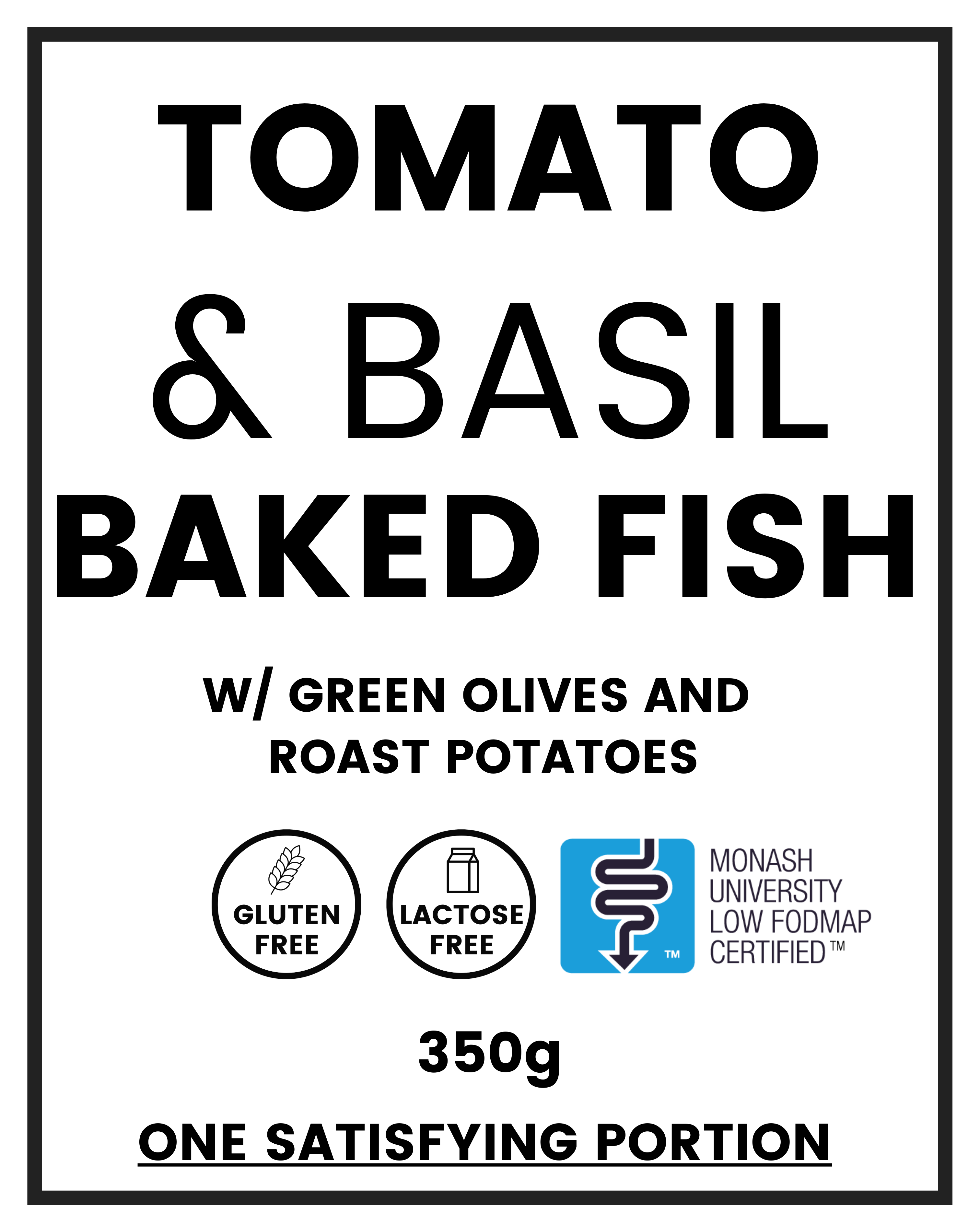 Rockling (fish)(27%), Crushed Tomatoes (Crushed Tomatoes, Acidity Regulator 330)(22%), Carrots (16%), Chat Potatoes (15%), Cherry Tomatoes, Fennel, Zucchini, Green Olives (Olives, Water, Salt, Wine Vinegar, Citric Acid, Australian Canola Oil)(2%), Spring Onions (Green Portion only), Baby Spinach, Parsley, Basil (1%), Garlic Infused Olive Oil (no garlic flesh), Heart Salt (Potassium Chloride, Sodium Chloride, Thaumatin).