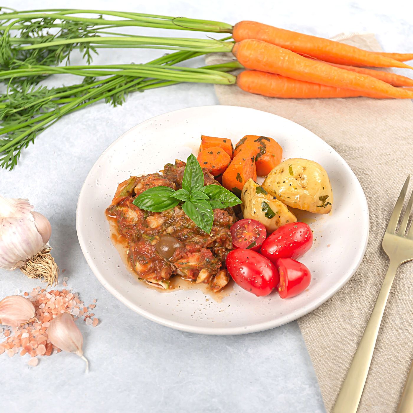 New Zealand Rockling is the star of this meal - cooked in a basil, garlic oil, tomato and green olive sauce. The meals is served with roasted chat potatoes, cherry tomatoes and carrots plus spinach and parsley. It's a great way to get some fish in your weekly diet plus a wonderful mix of vegetables for colour, flavour and nutrition.