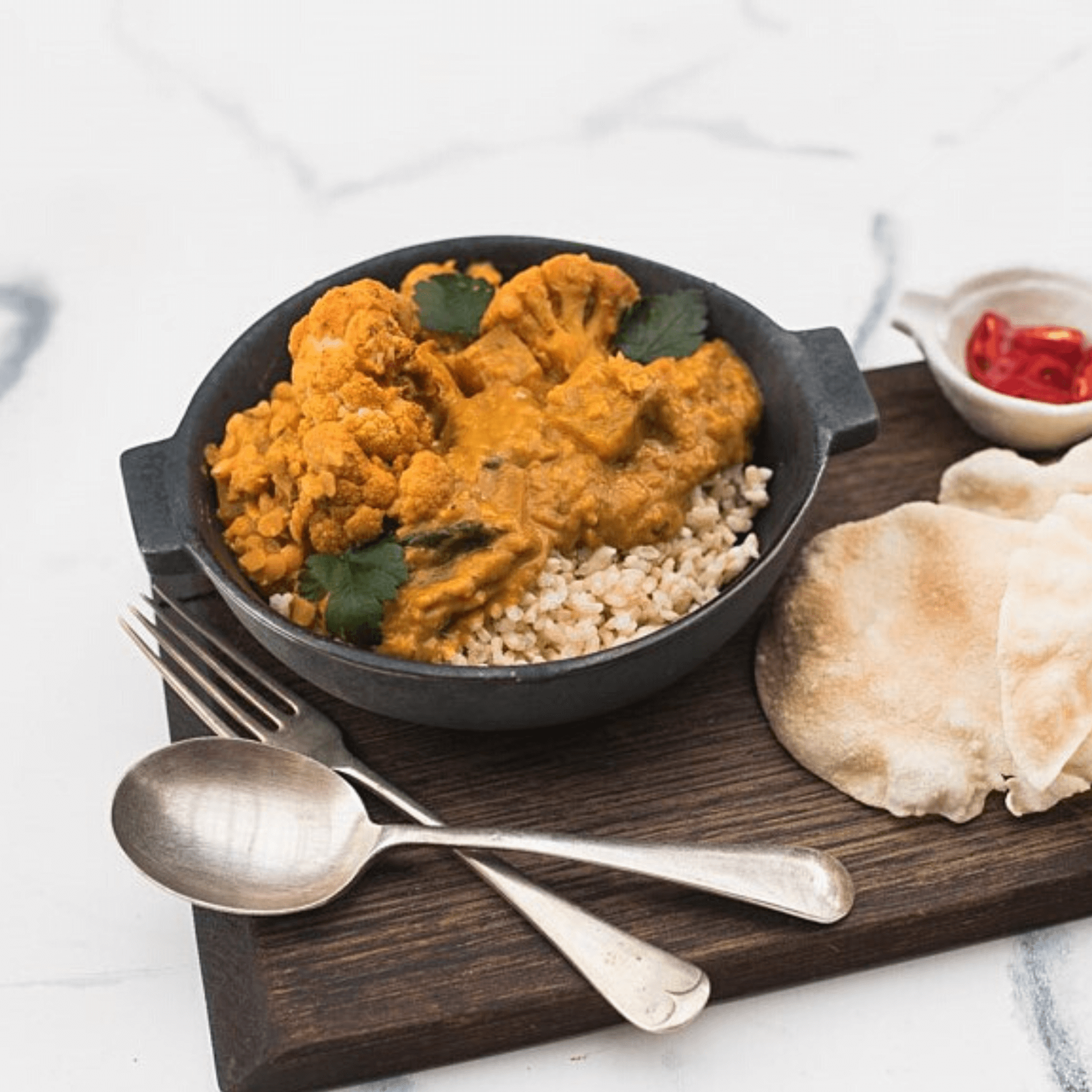 Vegan Dahl mixed with baby spinach and pumpkin and matched with roasted cauliflower spiced with turmeric and smoked paprika. Served with brown rice and roasted broccoli.