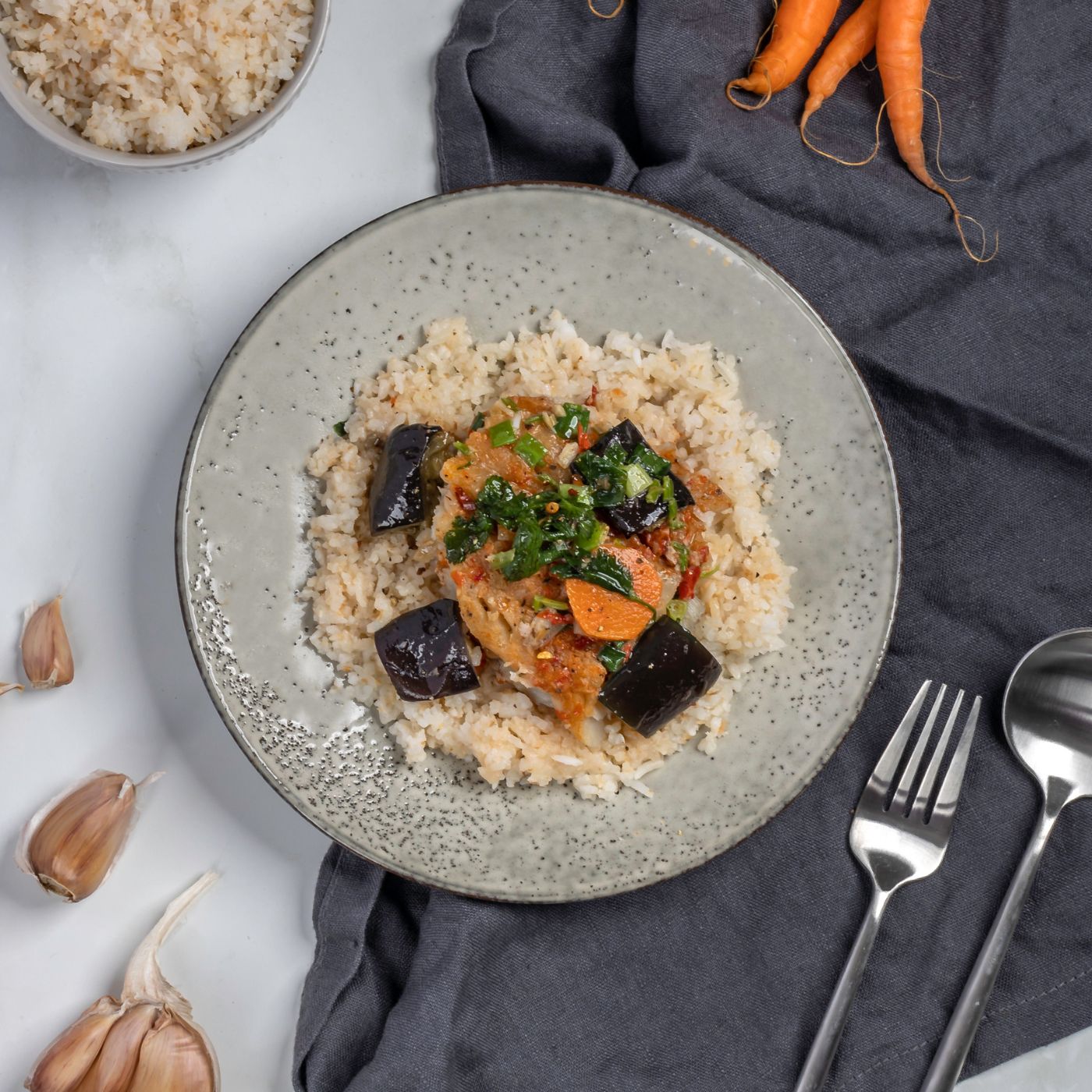 Water, Rockling (fish), Basmati Rice, Eggplant, Coconut Milk Powder (Organic Coconut Milk, Maltodextrin), Carrot, Brown Onion, Red Capsicum, Desiccated Coconut (Coconut, Sulphites), Spring Onion, Red Chilli, Coriander, Garlic, Ginger, Lemon Juice, Lime Juice, Heart Salt (Potassium Chloride, Sodium Chloride, Thaumatin), Caster Sugar, Olive Oil, Lemongrass, Fish Sauce (Anchovy Extract, May contain traces of Crustacea), Vegetable Oil, Cornflour, Kaffir Lime Leaves, Cumin Seeds, Black Pepper, Coriander Seeds, Salt.