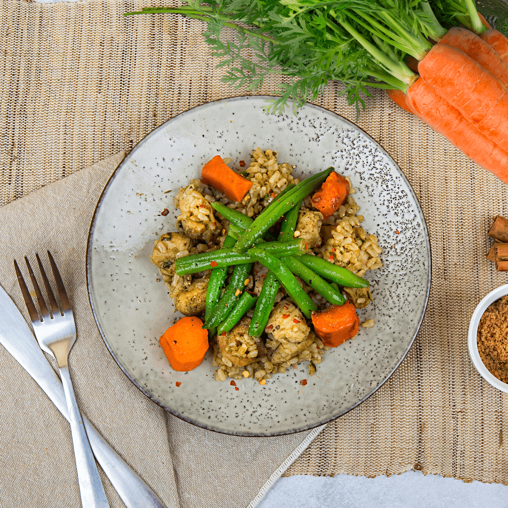 This is the We Feed You take on a Caribbean Jerk Chicken, which is a popular street food traditionally full of onion and garlic, and cooked over an open flame or grill. Our Low FODMAP version draws on the other key flavours and uses our very own spice marinade bringing together a combination of spring onions (green portion only), green capsicum, lime juice, ginger and a hint of chilli. The chicken breast is diced and marinated then roasted in the oven and finally mixed through a delicious and flavoursome lime brown rice.